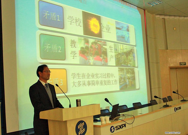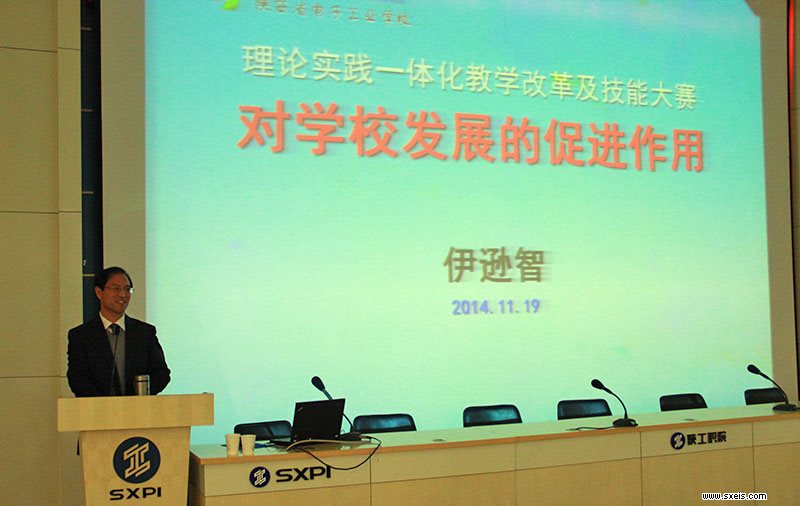 2014年11月19日下午,我校伊逊智校长应省教育厅相关领导要求,在陕西工业职业技术学院为2014年陕西省中等职业学校教学管理人员培训班学员,作了题为《理论实践一体化教学改革及技能大赛对学校发展的促进》的专题讲座。讲座中,伊校长结合我校教学改革和技能大赛实际情况,详细介绍了我校“理论实践一体化”的主要做法和取得成效,重点阐述了“理论实践一体化”教学改革的优势、基础条件及实现办法,并与参会学员进行了热烈互动,调动了大家对“理论实践一体化”教学模式的极大兴趣。来自全省中等职业学校的教务科长、专业教研室主任共计100多人听取了讲座。