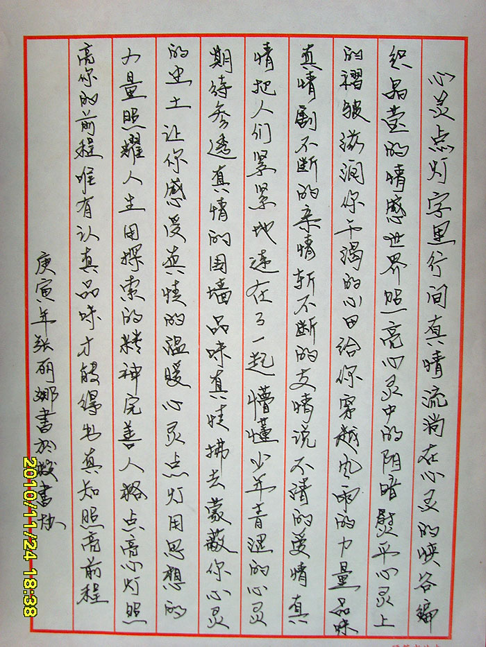 本次展出作品主要出自于现在校就读的09级及2010级新入校的学生,作品涉及软笔、硬笔、绘画及十字绣等种类,共有150多幅。这些作品均为2010年9月至今近3个月的练习成果,作品虽略显稚嫩,但它彰显了我校学生参与书画活动的热情,也为我校“和谐校园”的营造了良好的文化氛围。