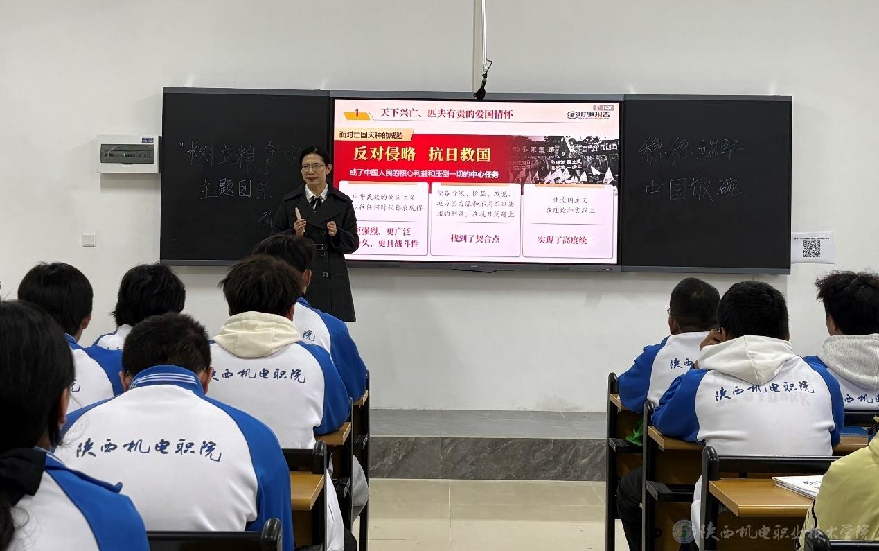 10月21日下午,陕西机电职业技术学院党委副书记张琴在蟠龙校区启航楼207教室为25城轨信号、25铁道工程5合班学生讲授形势与政策课《纪念抗战胜利 坚定民族信念》专题内容。